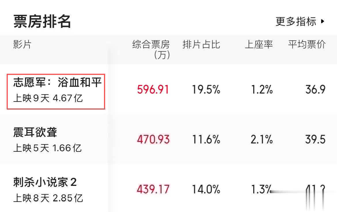 成绩最耀眼的作品《志愿军:浴血和平》,目前累计票房也仅有4亿多,预测总票房6亿出头,其余电影就更不必多说。
